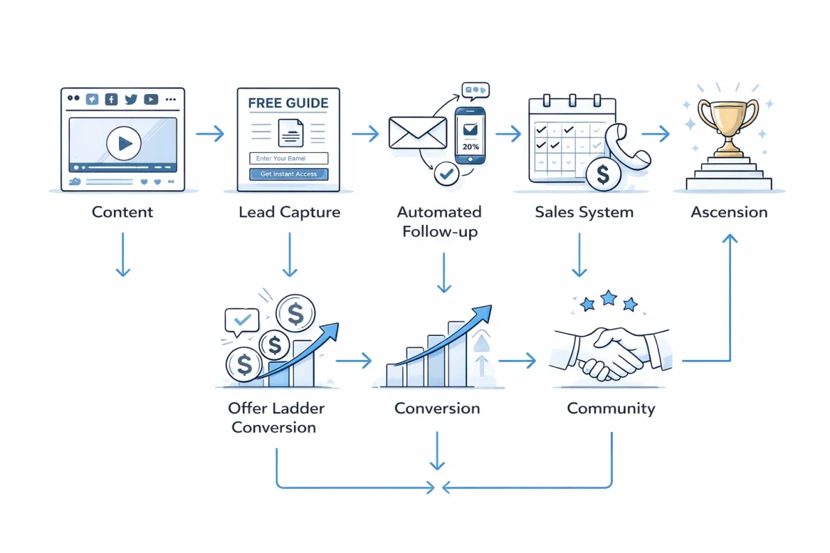 No. Social is just the top of funnel. This builds the infrastructure underneath: lead capture, follow-up, sales, and offer ladder conversion.